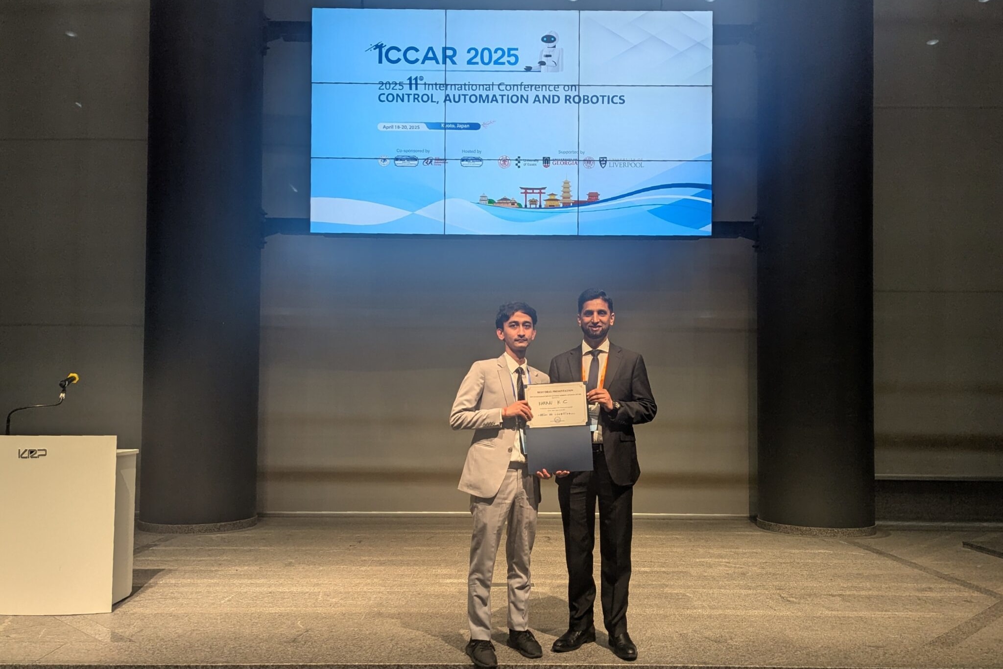 2025/09/08 ロボティクスチームが第1回関西夏ロボコン2025で優勝 本学ロボコンチーム(KUASロボコン)が,8月23日に大阪府大東市のアクティブスクエア大東体育館で開催された第1回関西夏ロボコン2025で見事優勝を果しました.関西夏ロボコン2025詳細→ https://kansai-harurobo.org/kansai_natsurobocon/本学工学部でロボット工学やメカトロニクスを専攻する学部生11人で構成されたチームです.実践的な工学技術,プロジェクト管理,リーダーシップスキルの向上のため定期的に地域コンテストに参加しています. 2025/06/20 博士課程学生Reneさんロボティクス研究で表彰 日本ロボット学会第42回学術講演会(RSJ 2024)においてSuarez Flores氏が表彰されました.論文「双方向型ソフト空気圧ロボットフィンガーの性能に及ぼすテーパーおよびチャンバー形状の影響」により、国際セッション最優秀発表賞のファイナリストに選出されました.授賞式は2024年9月3日から6日にかけて大阪で開催されました.この革新的な研究は,適応的な把持や精密な取り扱いなど,正確で柔軟な操作を必要とする分野において大きな応用可能性を秘めています. 2025/05/13 修士課程のKaran KCさんがICCAR 2025で最優秀口頭発表賞を受賞 大学院工学研究科の修士課程2年生であるKaran KCさんが,ロボット工学分野の新進気鋭の才能を称える重要な賞として,第11回制御・オートメーション・ロボティクス国際会議(ICCAR 2025)において最優秀口頭発表賞を受賞しました.世界中から一流の研究者やイノベーターが集まるこの名誉ある会議は,4月18日から20日まで京都で開催されました. 2025/03/28 関西春季ロボコン2025で3位を獲得 工学部の留学生チームが,素晴らしい成果を収めたことを大変嬉しく思います.権威ある関西春季ロボコン2025に初出場した「KUASロボコン」チームは,見事3位入賞を果たしました.この勝利は、学生たちの献身的な姿勢,チームワーク,そして革新的精神,そしてKUAS工学部で育まれた支え合う環境の賜物です.私達の研究室の学生で構成されたKUASロボコンチームは,大会を通して卓越したスキルとチームワークを発揮し予選リーグでは全勝し,決勝トーナメントに進出しました. 2025/02/20 ロボット研究が国際シンポジウムで表彰される 工学部のパスート・スリヤソンブーンさんとレネ・スアレスさんは,京都で開催された第8回群集行動とバイオインスパイアードロボティクスに関する国際シンポジウム(SABRO)で表彰されました.彼らの研究論文は国際的な専門家パネルを魅了し,生物学(バイオインスパイアードデザイン)部門の最優秀論文賞を授与されました.この輝かしい功績に加え、彼らは同じく競争の激しい生物学(バイオインスパイアードデザイン)部門において,最優秀学生論文賞のファイナリストにも選出されました. 2024/04/17 ニサールラボ国際会議で最優秀論文賞を受賞 米国のウースター工科大学(WPI)からの訪問学生チームが,サジッド・ニサール教授の指導の下,第29回人工生命とロボティクスに関する国際シンポジウム(AROB 2024)において最優秀論文賞を受賞しました.2024年1月24日から26日まで大分県別府市で開催されたAROBは,人工生命とロボティクスの分野における最高峰のフォーラムであり,世界中から研究者や学生が集まります. 2024/03/25 タイからの学生が太秦キャンパスを訪問 工学棟見学の後,サジッド・ニサール博士の研究室を訪問しました.同研究室は,ロボット工学,機構設計,ハプティクス,フレキシブルマニピュレーターの研究を専門としています.ニサール博士の学生2名はタイ出身で,母国から来た若い研究者と積極的に交流し,研究の進捗状況について話したり,プレゼンテーション中に多くの質問に答えたりしていました.リアン博士の研究室と同様に,ニサール博士の学生たちもすぐに使える研究機器を展示し,実際に使ってみた教職員や学生を魅了していました. 2023/10/12 IEEE World Haptics 2023最優秀准編集者賞を受賞 KUASの准教授であるサジド・ニサール博士は, 電気電子学会(IEEE)が主催し,オランダのデルフトで開催された触覚とヒューマンマシンインタラクションに関する国際会議 の 第一人者,2023 IEEE World Haptics Conference (WHC)において「最優秀准編集者」賞を受賞しました.この賞は,会議の准編集者としてのニサール博士の模範的な役割が認められて授与されました.
